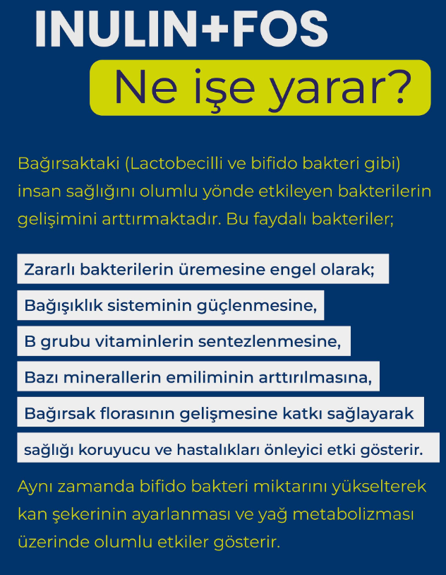 Bağırsaktaki faydalı bakterilerin gelişimini artıran INULIN+FOS, zararlı bakterilerin üremesini engelleyerek sağlığınıza katkı sağlamakta yardımcı olur.. Bu prebiyotik lif takviyesi, bağışıklık sistemini güçlendirmekte yardımcı olur., B grubu vitaminlerin sentezine yardımcı olur ve bazı minerallerin emilimini artırmakta katkı sağlar. Ayrıca, bağırsak florasının gelişmesine destek olarak hastalıkları önleyici etki gösterebilir.. Bifido bakteri miktarını yükselterek kan şekeri düzeyini düzenler ve yağ metabolizmasını olumlu yönde etkileyebilir.