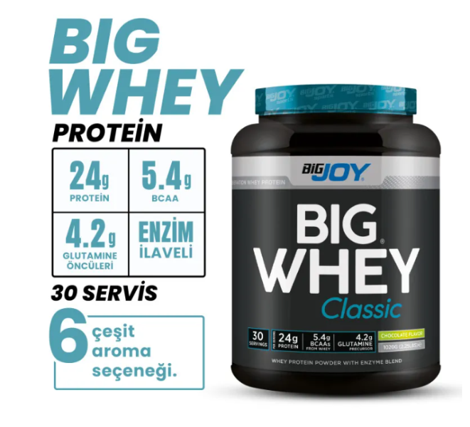 Bigjoy Bigwhey, yüksek kaliteli ithal hammadde kullanılarak üretilmiş, sindirim enzimi ilaveli bir whey protein tozu desteğidir. %100 peynir altı suyundan elde edilen protein içeriğiyle, günlük protein ihtiyacının karşılanmasına ve egzersiz sonrası toparlanmanın desteklenmesine yardımcı olur.